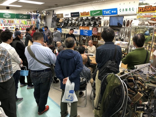フライコーナー中央のテーブル、通称「巻き場」ではティムコ嶋崎了さんと、C&Fデザイン佐々木岳大さんがフライタイイングデモンストレーションを披露してくださいます。