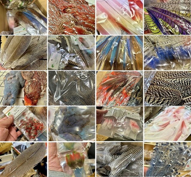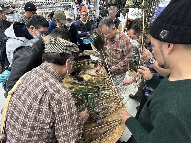 岩崎さんがその場でピーコック解体を披露して下さり、カッティングしたてホヤホヤの新鮮なマテリアルを購入する事が出来るのも魅力ですね。入手しにくいピーコックレッグ、ピーコックマラブー、トッピング、ハーフムーンなどなど、解体ショーは格好の入手チャンスになりますよ。