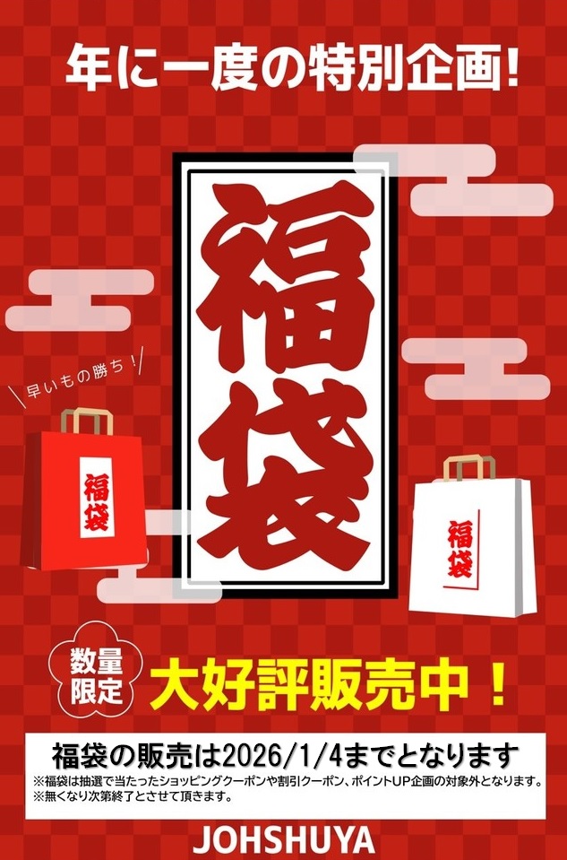 1月4日(日)までの期間数量限定!スタッフ厳選の【福袋】販売中!!※福袋はポイント倍増やショッピングクーポン券・レシートクーポン値引きの対象外とさせていただいております。あらかじめ、ご了承いただきますよう、お願い申し上げます。