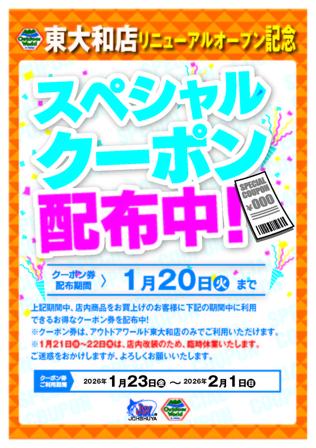只今、上州屋アウトドアワールド東大和店では店内商品お買い上げのお客様に同店リニューアルオープン後(1月23日~2月1日)にご利用いただけるスペシャルクーポン配布中! ※クーポン券の配布は1月20日(火)までとさせて頂きます。※クーポン券をご利用いただけるのは上州屋アウトドアワールド東大和店のみとなります。