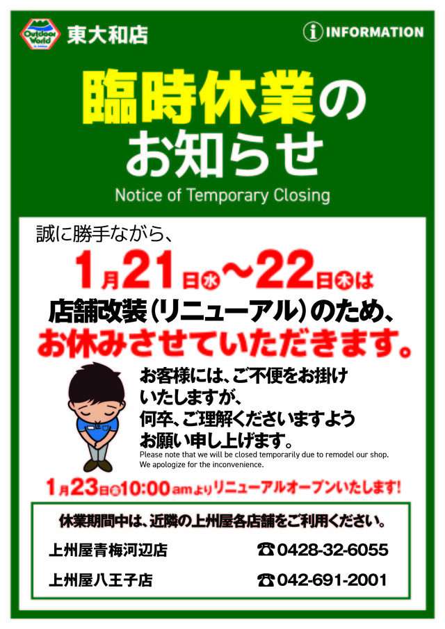 【いよいよ今週!】1/23(金)アウトドアワールド東大和店リニューアルオープン!各コーナー拡大! (2026/1/21)