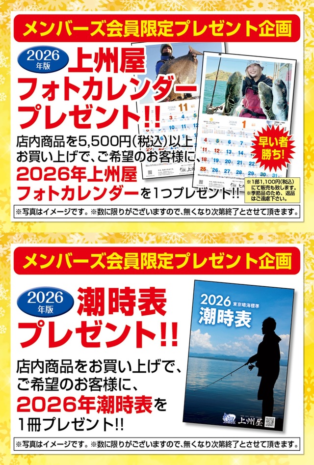 ◎店内商品税込み5,500円以上お買い上げのメンバーズ会員様でご希望の方には2026年上州屋フォトカレンダーをプレゼント!◎お買い物されたメンバーズ会員様でご希望の方には2026年潮時表も差し上げております。※どちらも無くなり次第終了となりますので、あらかじめご了承ください。 セール期間は年明けの1月12日(月祝)までです!どうぞこの機会をお見逃しのないよう、ご案内申し上げます!!