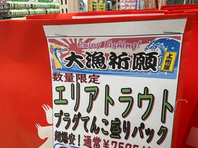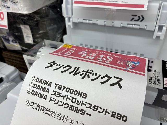 ルアーはもちろん、船釣り・堤防釣り用の福袋や、ボックス・クーラー・ライフジャケット、これからの時期必携の防寒用品などなど各種盛りだくさんのラインナップとなっております♪