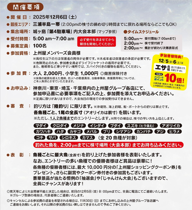 12/6(土)開催の城ヶ島釣り大会上州屋&サンラインカップ受付中↓↓↓