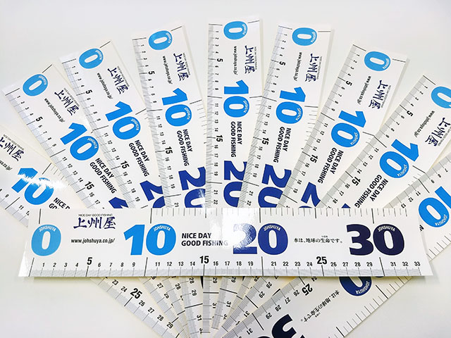 当店に自慢の釣果をお持ち込みいただいた皆様のうち、ご希望の方にクーラーボックス等に貼って魚のサイズを測れる「上州屋メジャーステッカー」を1枚プレゼント!