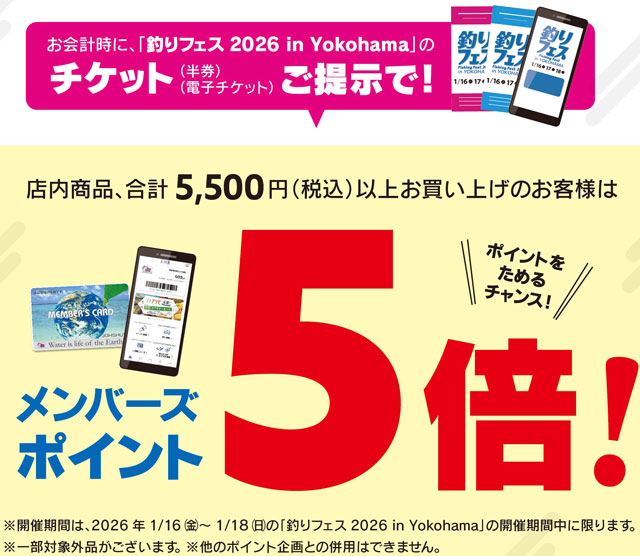 そして釣りフェスティバルの帰りは上州屋へGo!2026年1月16日(金)、17日(土)、18日(日)の3日間限定!上州屋各店でのお会計時に「釣りフェス2026のチケット(半券・電子チケット)」をご提示いただくと、店内商品合計5,500円(税込)以上お買い上げでメンバーズポイント5倍!