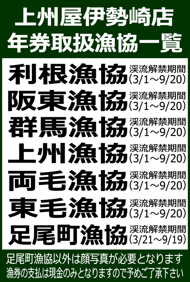 ※足尾町漁協以外は免許証サイズの顔写真が必要となりますので予めご用意をお願い致します。