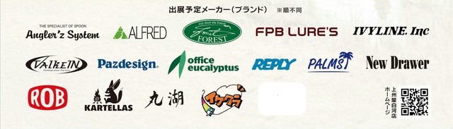 アングラーズシステム・アルフレッド(初)・フォレスト・FPBルアーズ・アイビーライン(初)・ヴァルケイン・パズデザイン(初)・オフィスユーカリ・リプライ・パームス(初)・ニュードロワー(初)・ロブルアー・カルテラス(初)・丸湖・イケクラ(初)