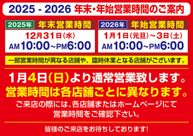 1月1日(元旦)、2日(金)、3日(土)の3日間は年末・年始特別営業時間となり、各店通常とは営業時間が異なります。