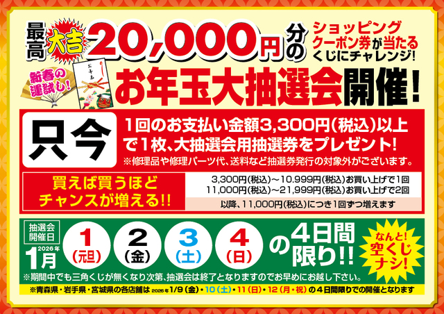 新春運試し!1月1日(元旦)、2日(金)、3日(土)、4日(日)の4日間限定、最高大吉20,000円分のショッピングクーポン券が当たる、お年玉大抽選会を開催します!なんと空クジなし!店内商品1回のお支払い金額3,300円(税込)以上お買い上げでチャレンジ!