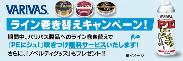 当日にバリバス製品のお買い上げ、またはラインの巻替え実施で「PEにシュッ!」の無料吹き付けサービスを実施します!