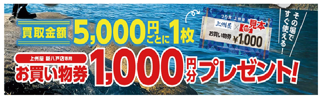 コラボ特典として、買取金額5,000円毎にその場ですぐ使える新八戸店専用の「つり具上州屋ショッピングクーポン券」を1,000円分プレゼント!