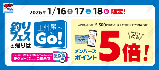 2026年1月16日(金)、17日(土)、18日(日)の3日間限定!上州屋各店でのお会計時に「釣りフェス2026のチケット(半券・電子チケット)」をご提示いただくと、店内商品合計5,500円(税込)以上のお買い上げでメンバーズポイント5倍!