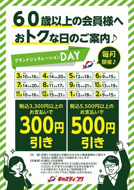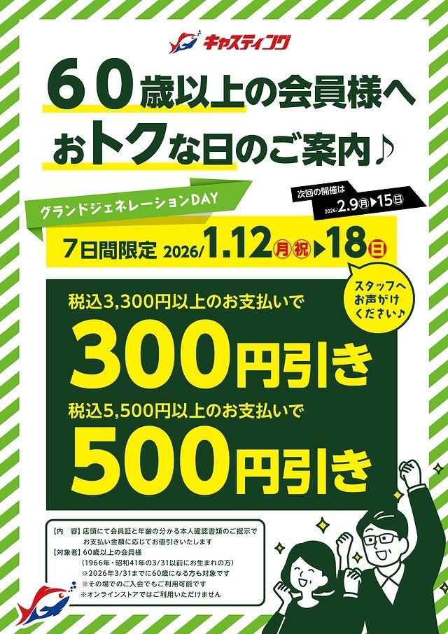 足立環七店☆1/12(月)~1/18(日)60歳以上の会員様へおトクな日のご案内♪【グランドジェネレーションDAY】☆ (2026/01/12)
