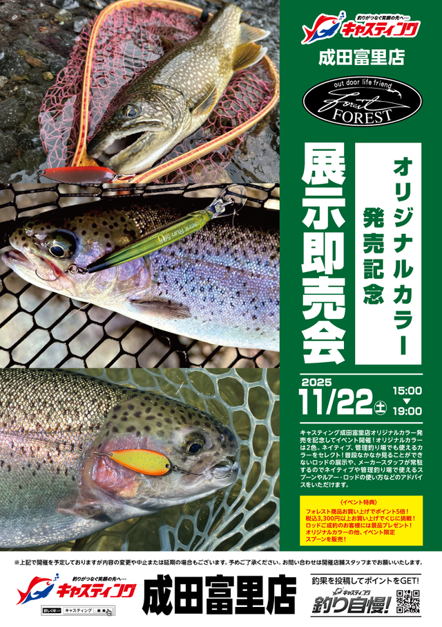 オリジナルカラーは2色。ネイティブ、管理釣り場でも使えるカラーをセレクト!普段なかなか見ることができないロッドの展示や、メーカースタッフが常駐するのでネイティブや管理釣り場で使えるスプーンやルアー・ロッドの使い方などのアドバイスをいただけます。