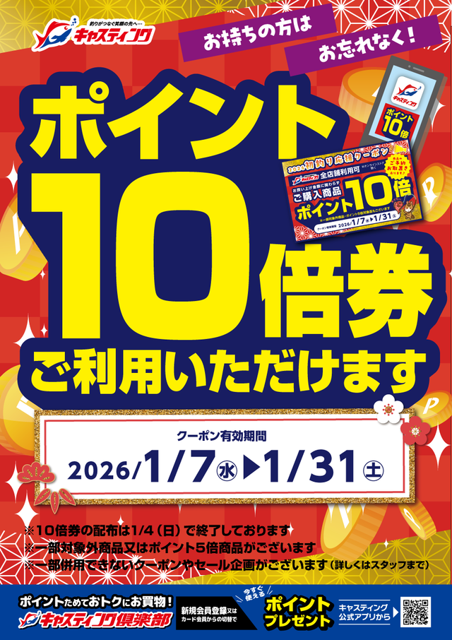 キャスティング全店(オンラインストア除く)にて、12/24(水)~1/4(日)の期間中、お買物いただいたお客様全員にレジにてプレゼントしていた【ポイント10倍券】がいよいよ使用解禁となります!!