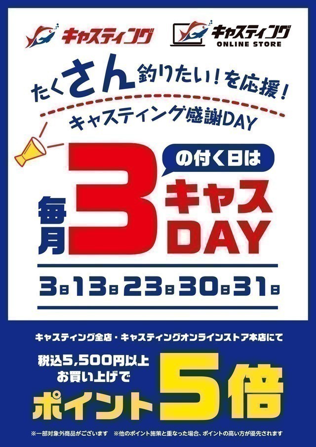 毎月3日・13日・23日・30日・31日は、お客様の「たく“さん”釣りたい!」気持ちをキャスティングが応援します!