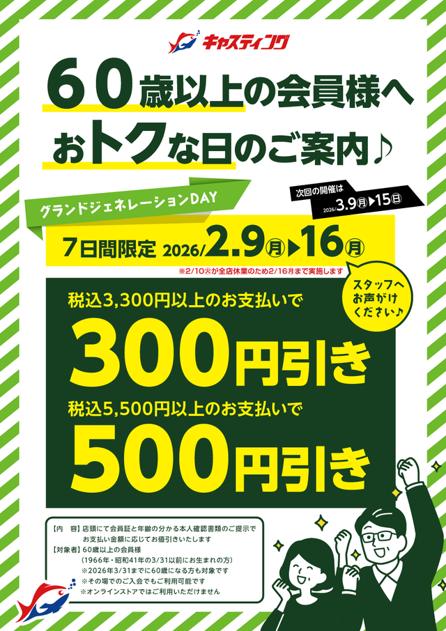 60歳以上の会員様、店舗スタッフへお声がけください♪