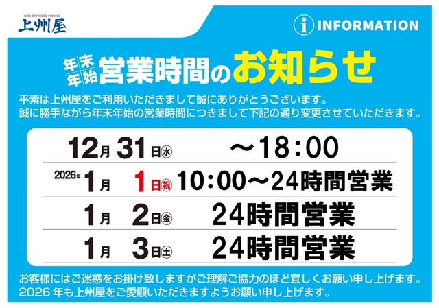 旧年中は上州屋豊橋小向店をご愛顧いただき、誠にありがとうございました。