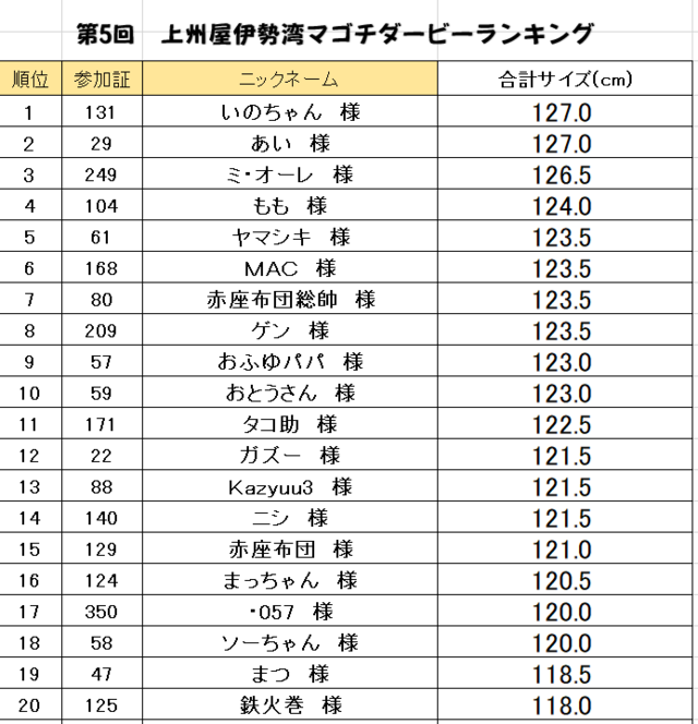 マゴチ2匹長寸(同寸の場合は持ち込みの早い方が上位になります)