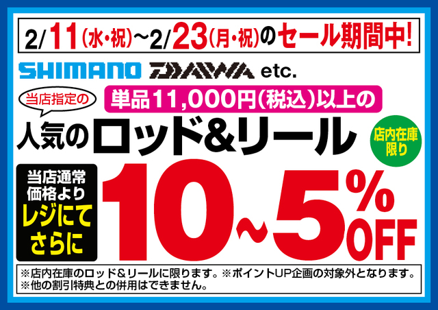 〔都内8店限定〕セール期間中、シマノ・ダイワetc.当店指定、単品11,000円(税込)以上のロッド&リールが当店通常価格よりレジにてさらに10~5%OFF!※店内在庫のロッド&リールに限ります。※ポイントアップ企画の対象外となります。※他の割引特典との併用は出来ません。