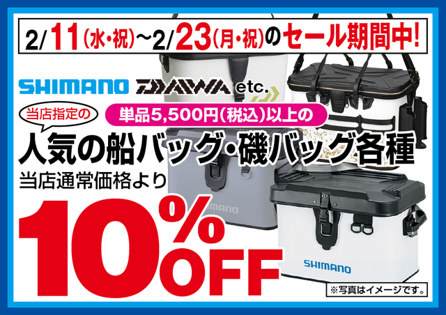 当店指定の¥5.500(税込)以上の磯バック・船バック各種がレジにてさらに10%OFF!