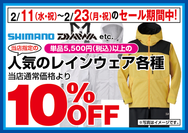当店指定の¥5.500(税込)以上のレインスーツがレジにてさらに10%OFF