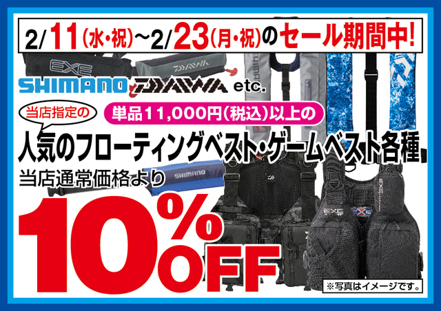 当店指定の¥11.000(税込)以上のフローティングベストがレジにてさらに10%OFF
