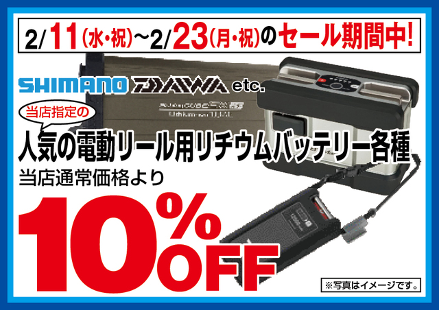 シマノ、ダイワ、ハピソン、八洲電業などの電動リール用リチウムバッテリーが当店通常割引価格よりレジにてさらに10%OFF!