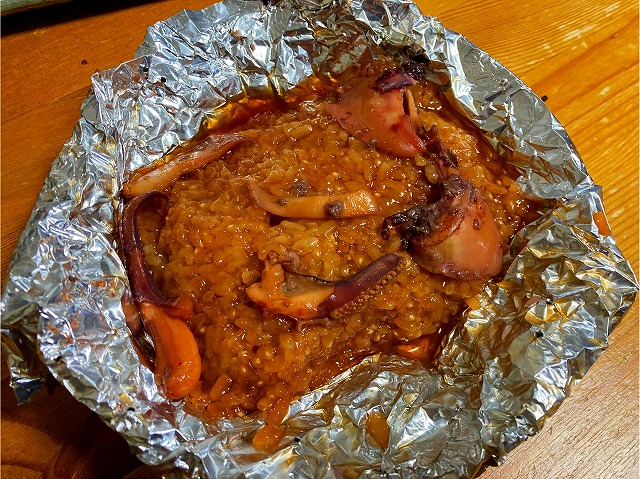 そんな時は、アルミホイルにもち米を入れて、適当にゲソや野菜を入れて