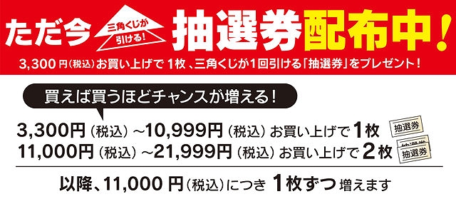 ※抽選券は3,300円(税込)以上~10,999円(税込)お買い上げで1枚、11,000円(税込)~21,999円(税込)お買い上げで2枚、以降11,000円(税込)につき1枚づつ増えます!※一部、抽選券発行の対象外商品がございます。