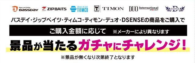 バスデイ・ジップベイツ・ティムコ・DUO・DSENSE製品をお買い上げで、購入金額や購入個数に応じて、景品が当たるクジにチャレンジしていただけます!